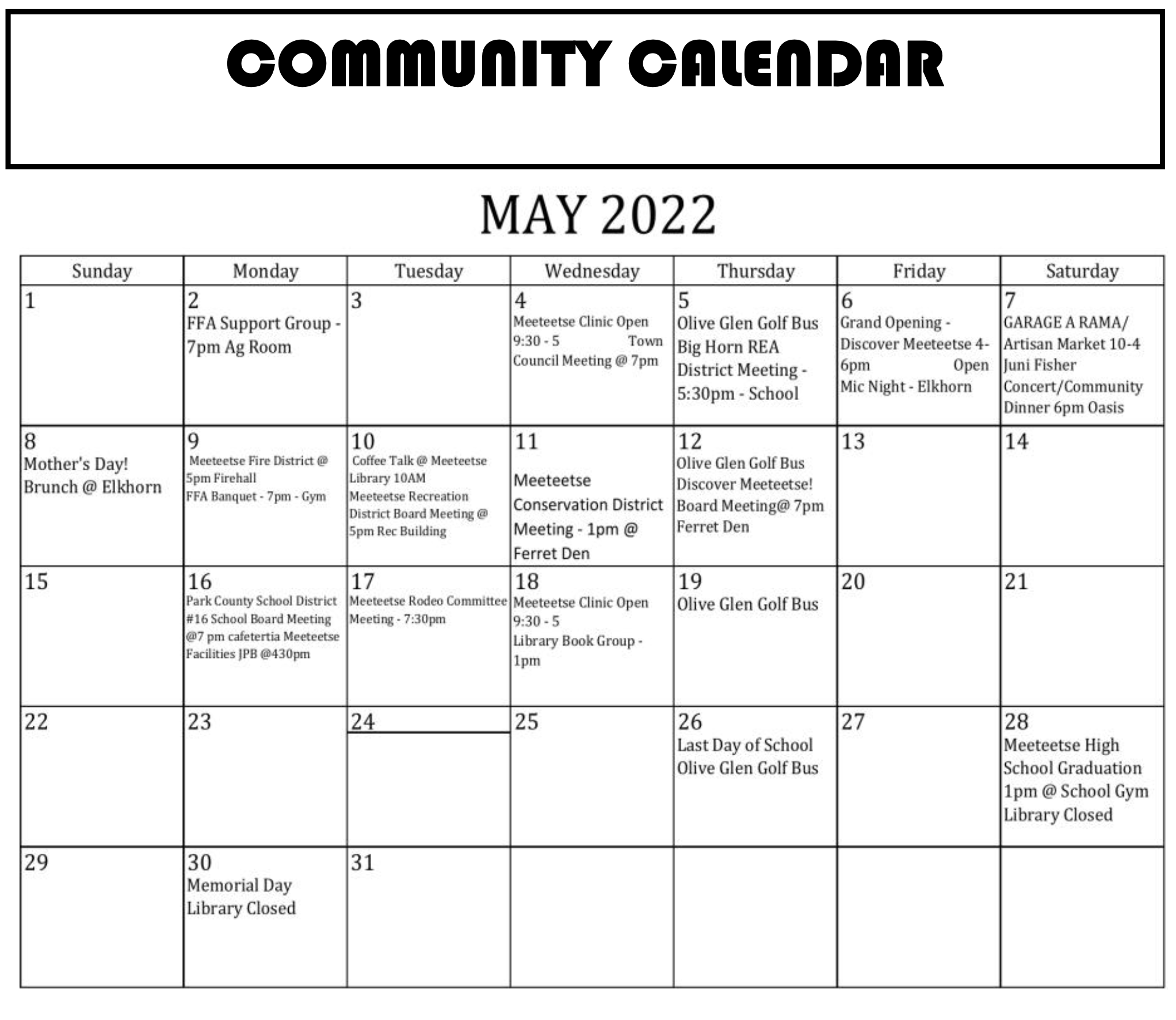 The Library will be CLOSED the Saturday and Monday of Memorial Day Weekend.